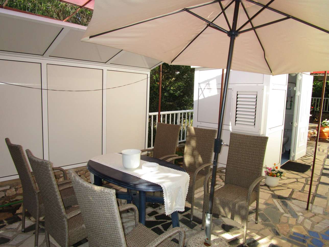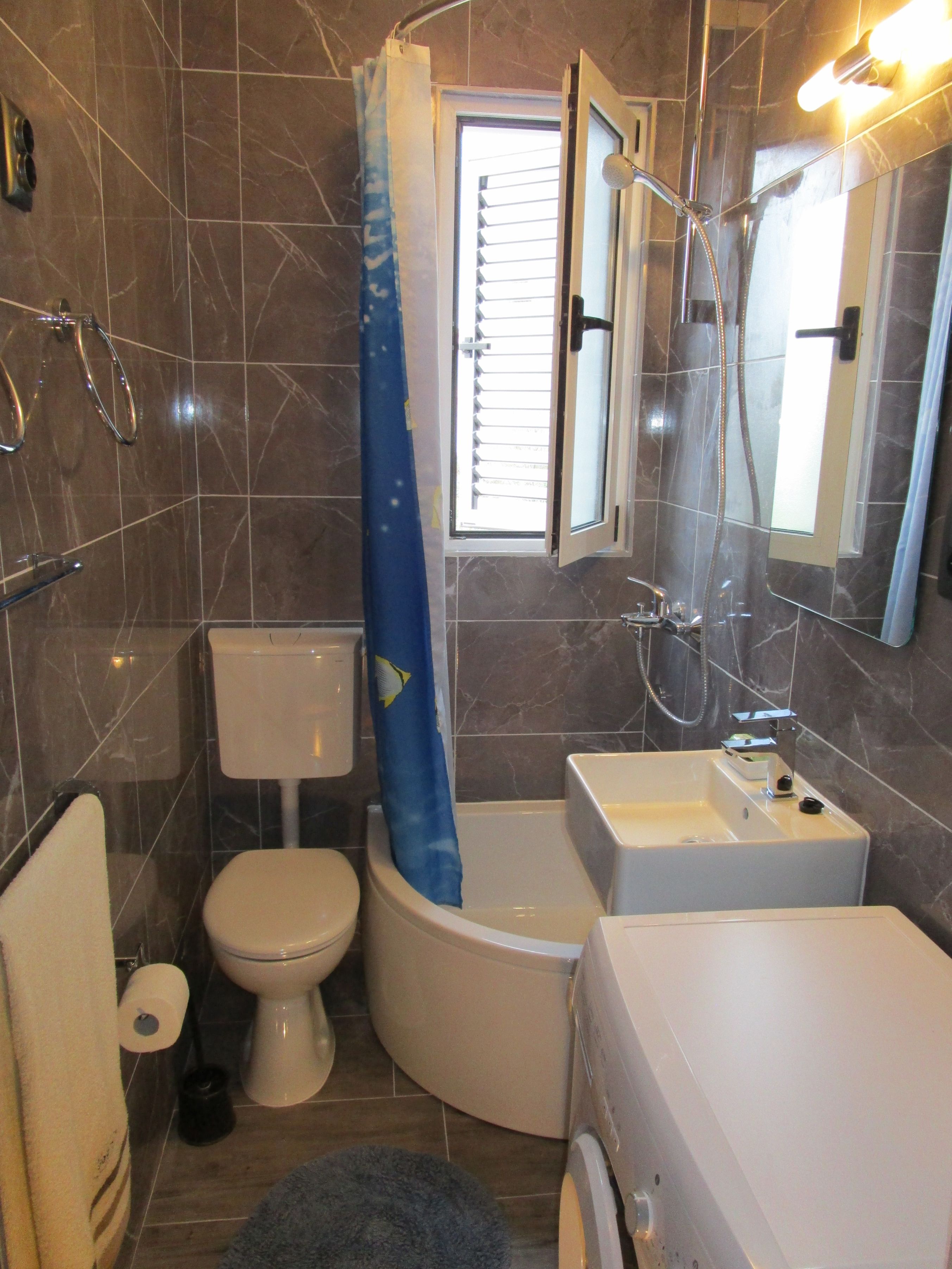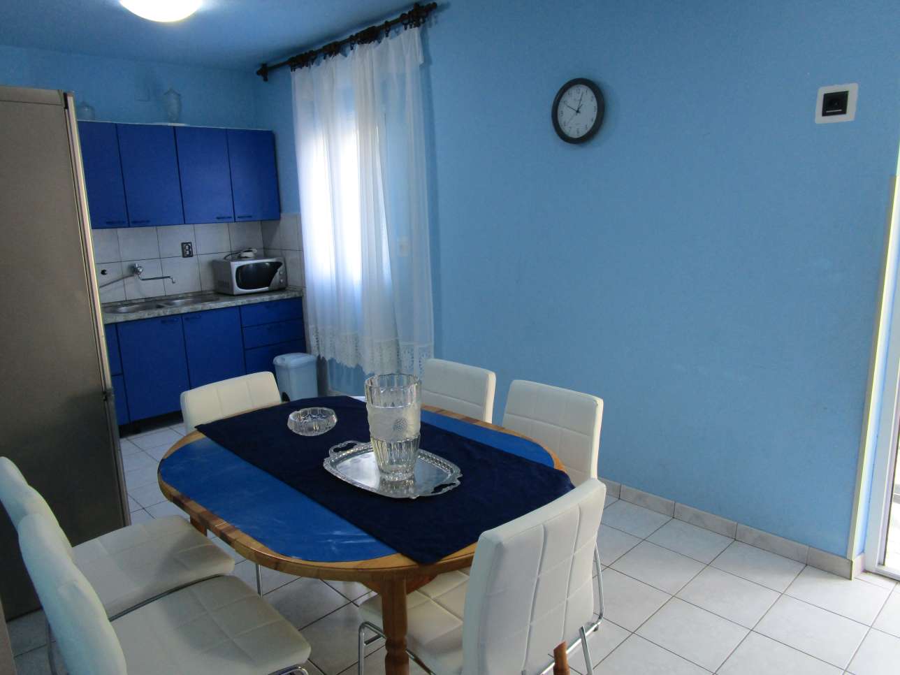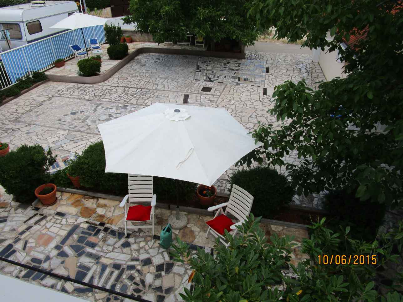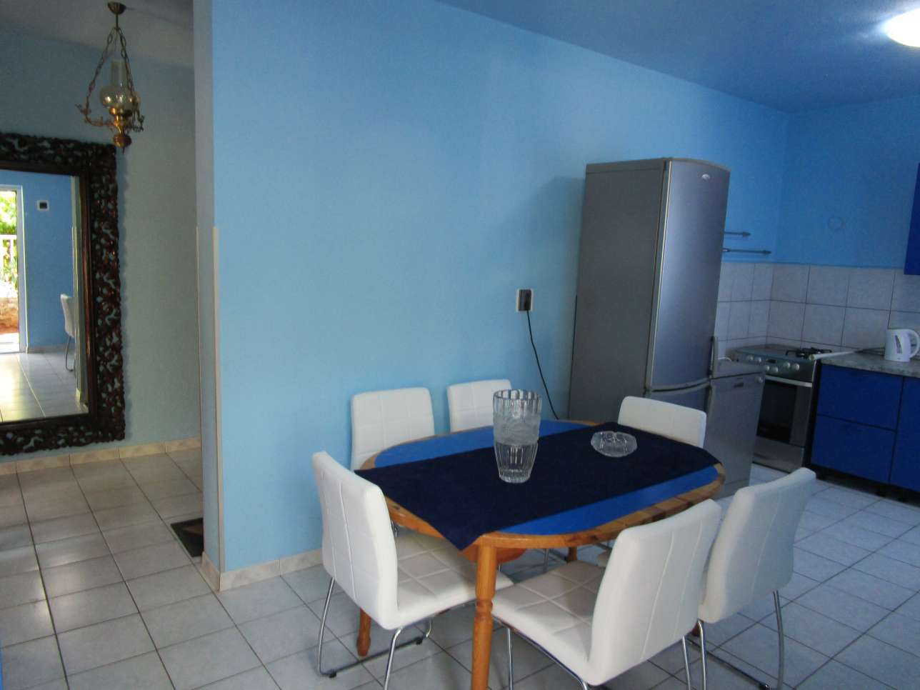 Apartman br. 1 je u prizemlju. Sastoji se od: tri sobe, 8 ležaja, površine 95 m2. Grill pred ulazom površine 10 m2. Kompletno opremljen s mašinom za rublje i mašinom za posuđe. Ima: veliku kupaonicu i toalet u vrtu, kuhinju s trpezarijom i veliku terasu.
